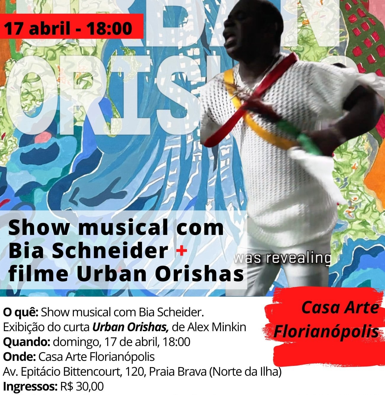 April 17th, 2022 Brazilian premiere of Urban Orishas with concert by Bia Schneider. Casa Artes, Florianopolis