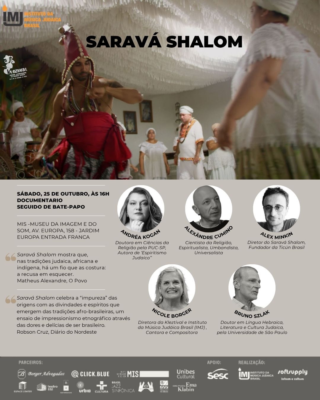25 de outubro, 16:00 Saravá Shalom, Museu da Imagem e do Som (Kleztival), São Paulo